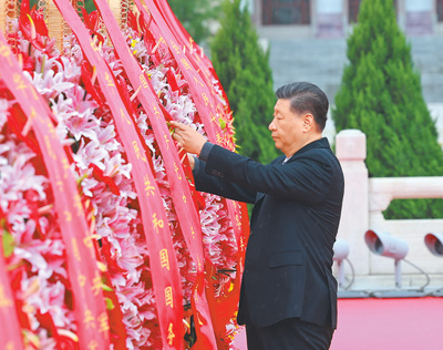 9月30日上午,黨和國家領(lǐng)導(dǎo)人習(xí)近平、李強(qiáng)、趙樂際、王滬寧、蔡奇、丁薛祥、李希、韓正等來到北京天安門廣場(chǎng),出席烈士紀(jì)念日向人民英雄敬獻(xiàn)花籃儀式。這是習(xí)近平整理花籃上的緞帶。