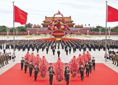 10時(shí)整,向人民英雄敬獻(xiàn)花籃儀式正式開始。軍樂團(tuán)奏響《義勇軍進(jìn)行曲》,全場(chǎng)齊聲高唱中華人民共和國國歌。
